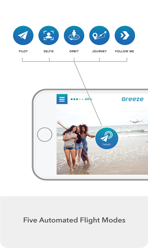 Capture life’s precious moments from an aerial view and share them instantly with Breeze, your flying camera. Use the Breeze Cam app and Breeze drone to make capturing photos of yourself simple and intuitive. We’ve created 5 automated flight modes that make capturing cool shots with Breeze easy for anyone, regardless of experience.