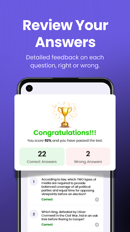 ¿Estás deseando aprobar el examen Life in the UK solo una vez? Nuestra aplicación hace que lograr esta hazaña sea fácil y divertido. Después de practicar con más de 500 preguntas y realizar más de 20 exámenes de práctica, ¡te sentirás súper listo para el examen!