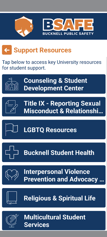 - Recursos de soporte: acceda a los recursos de soporte en una aplicación conveniente para disfrutar de una experiencia exitosa en la Universidad de Bucknell.