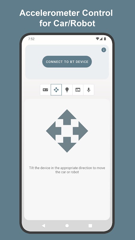 BT Remote Pro accelerometer page is used to control Bluetooth-based electronics projects via your smartphone motion. Go to the accelerometer page and tilt your smartphone in the appropriate direction to move your car or robot forward, left, right and reverse directions.