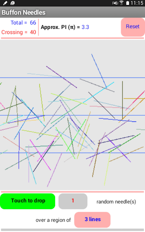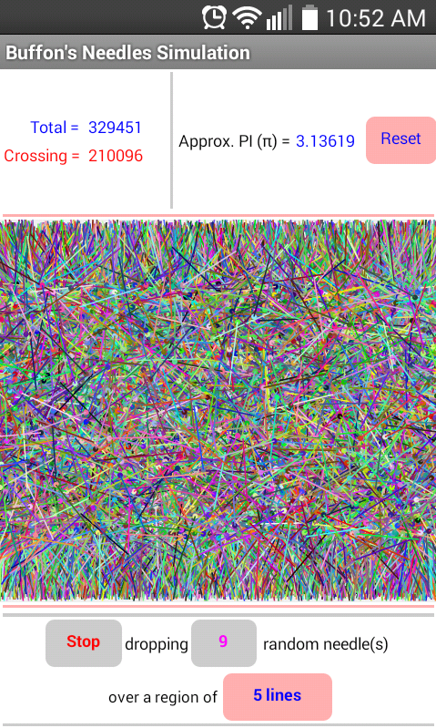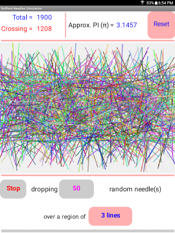 Buffon's Needle Experiment (BNE) is a classic problem of geometric probability, where one drops a needle randomly onto a region of evenly spaced parallel lines. This app simulates a simple case where the needle's length is the distance between two adjacent parallel lines. Let N be the total number of needles dropped at a certain moment; let C be the number of needles crossing lines. Let R = 2 × N ÷ C. R is an approximation of Pi ( π). In this app, the user can change the number of needles dropped at each time and the number of lines across the target region. Please be advised that the method converges very very slowly due to nature of the problem.