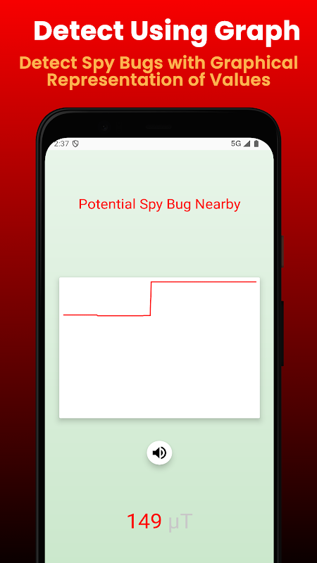 Este detector de errores espía tiene sus limitaciones y las lecturas del sensor magnetómetro dependen del dispositivo específico que utilice. Se requiere intervención humana para obtener resultados precisos. Si obtiene una lectura alta en el detector de errores, debe revisar el área manualmente para detectar dispositivos espía ocultos.