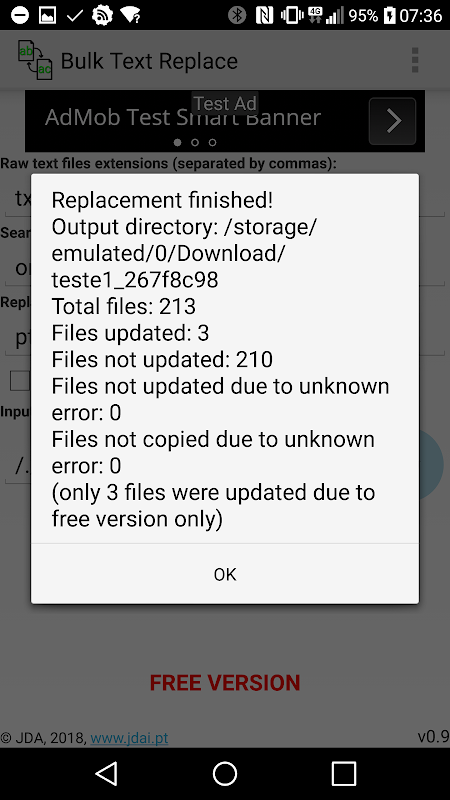 La versión gratuita reemplaza el texto de un máximo de 5 archivos a la vez. La versión premium elimina esta restricción y también elimina todos los anuncios de la aplicación.