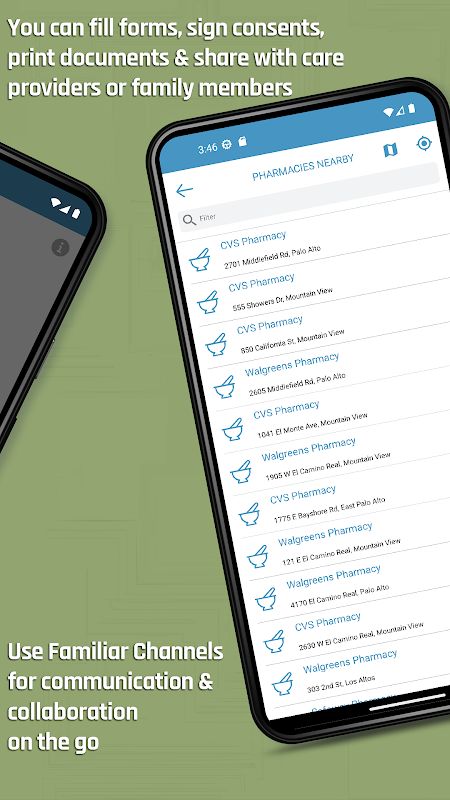 Con las opciones Explorar cerca, puede ubicar recursos de atención médica en una región determinada con solo unos pocos toques, ¡mucho más accesible que con los mapas de Apple o Google! Además, puede navegar a la ubicación o los sitios web para necesidades de atención médica urgentes.