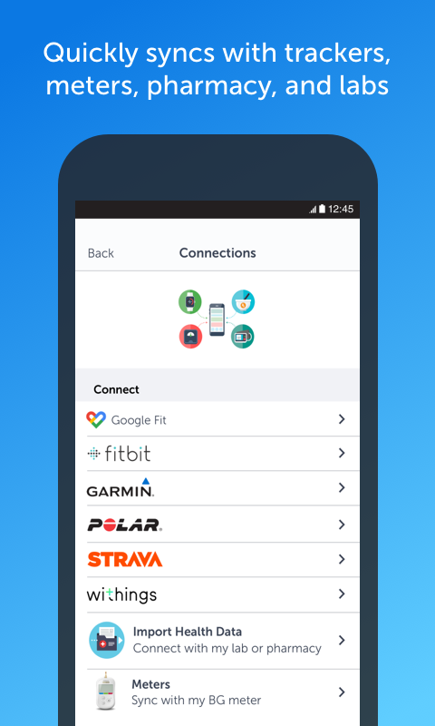 ● Sincroniza con seguidores de actividad física, farmacias, laboratorios y portales del paciente