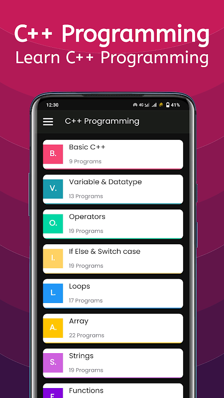 La aplicación "Learn C++" tiene una interfaz de usuario realmente simple e intuitiva. Es la mejor aplicación que te permite aprender el lenguaje de programación C++ de forma gratuita. ¿Entonces, Qué esperas? Descarga la aplicación ahora para convertirte en un experto en lenguajes de programación C++