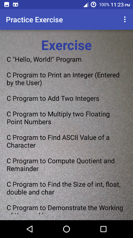 Esta aplicación de programación de C le ayuda con conceptos básicos de C. Hay casi más de 40 programas (Actualización de frecuencia). Las preguntas de la entrevista son casi 150 +. ejercicio de práctica de más de 100 preguntas. Esta aplicación basada fuera de línea se puede utilizar sin Internet. Todos los programas, teorías y ejercicios en la mano momento y lugar.