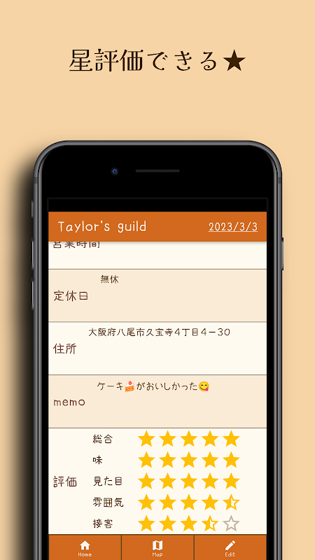Puede registrar su autoevaluación como una calificación de estrellas en incrementos de 0,5 en una escala de 5 puntos para general, sabor, apariencia, ambiente y servicio al cliente.