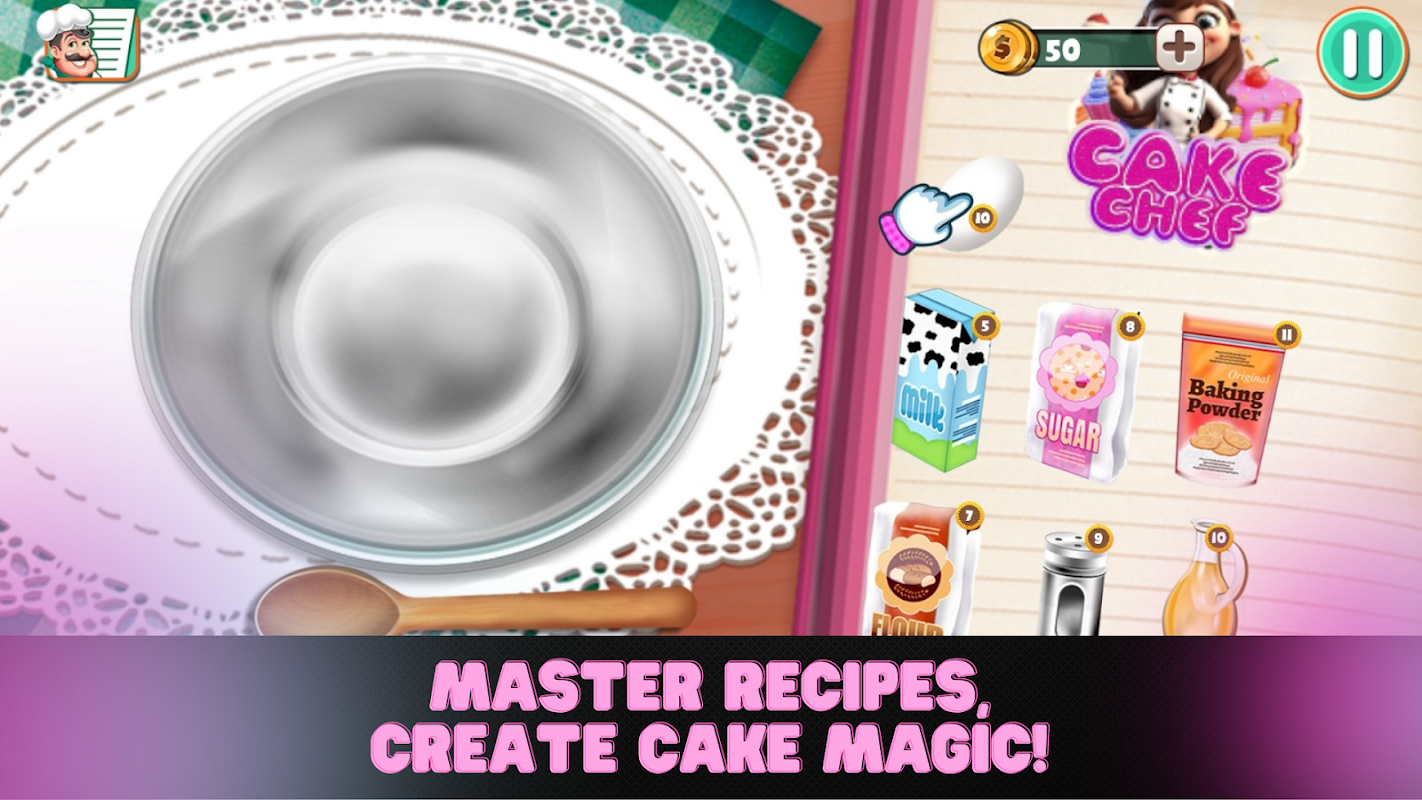 En Cake Chef, no solo estás horneando pasteles, ¡estás elaborando obras de arte comestibles! Desde clásicos favoritos hasta creaciones exóticas, cada nivel presenta un nuevo desafío para poner a prueba tus habilidades culinarias y creatividad.