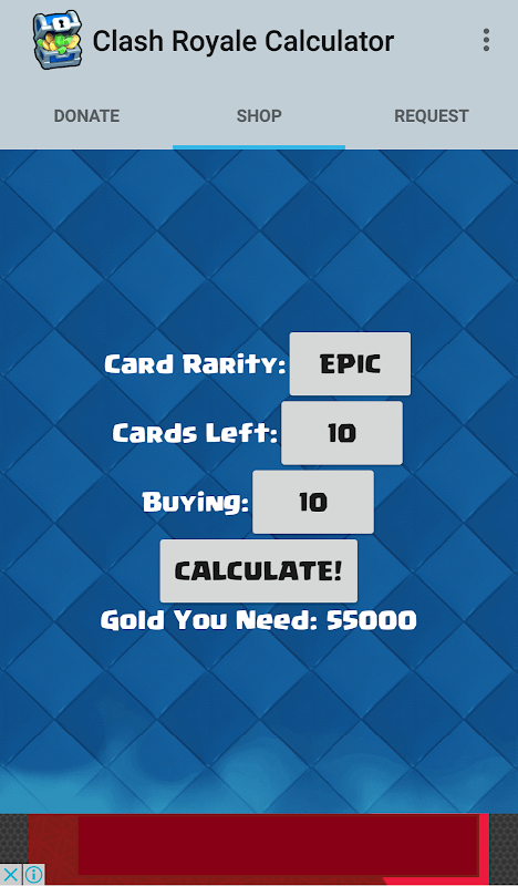 Feature 1: Frequently donates to your clan? Want to see how much you need to donate to earn x amount of gold? We have it made easy for you! Simply enter the gold you need and the application will tell you how much commons you need to donate and also the rares you need to donate.