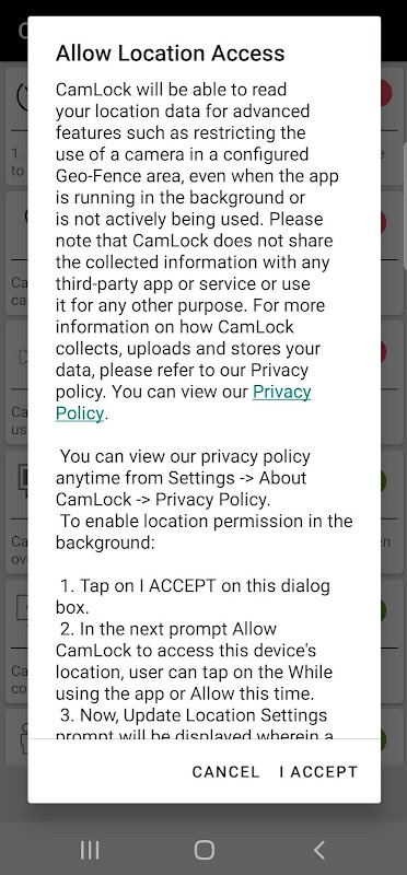 Habilitar ubicación de fondo: este estado de permiso se ha establecido en "Permitir todo el tiempo" para que la aplicación pueda capturar la ubicación del dispositivo. CamLock requiere este permiso para habilitar la función de administración avanzada de dispositivos, como restringir el uso de la cámara en una ubicación específica, etc.
