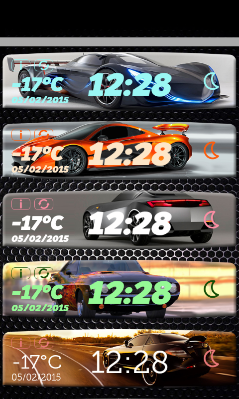 Don't waste your time watching the weather channel all day! Choose one of the exotic car clock and weather widgets and look how they start to sparkle showing the power of their beauty. You are probably still dreaming to become a race driver and have your own muscle car in the garage! If your blood pressure is rising with each gear changing and heart beats faster whenever you see the latest sports car passing by, you should definitely get this awesome weather widget for your mobile phone.