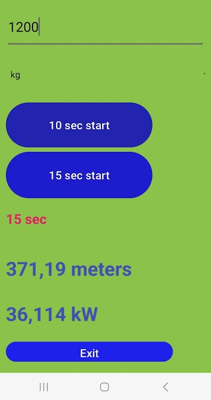Monte el teléfono en posición vertical si es posible. Luego haga clic en iniciar y conducir. No es necesario mirar la aplicación, ya que registrará la potencia máxima en kilovatios después de que haya transcurrido el tiempo seleccionado. También se muestra la distancia recorrida y el tiempo en segundos.