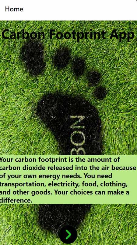 Esta aplicación trata sobre tu huella de carbono, esta aplicación te anima a ser más respetuoso con el medio ambiente. Desde esta aplicación podrás calibrar la cantidad de C02 emitida por alguien.