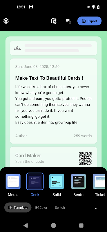 ¿Tienes palabras? ¡Conviértelas en tarjetas llamativas! Ya sea un mensaje emotivo, una felicitación navideña o una publicación para redes sociales, nuestra app convierte al instante tu texto en hermosos diseños para compartir. ¡No necesitas conocimientos de diseño!