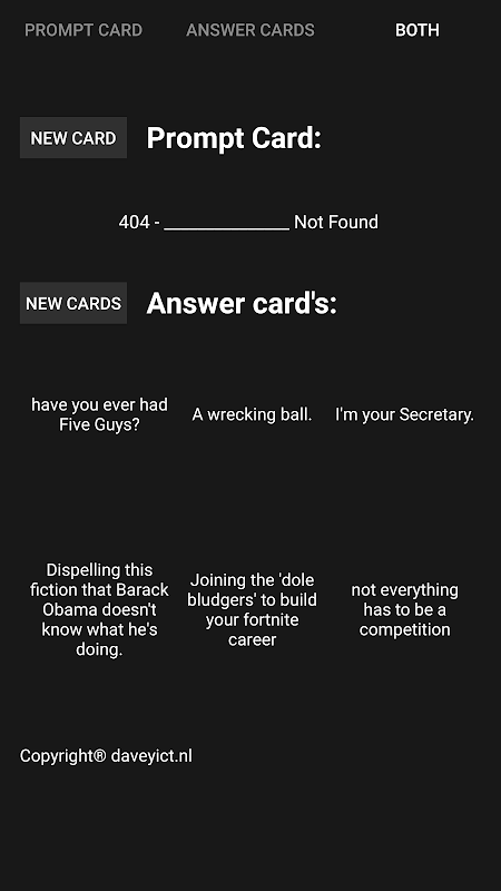 één iemand kiest een Prompt kaart en deze worden ingevuld door andere spelers Answer Kaarten, na deze geselecteerd te hebben druk je op accept. bij begin van een nieuwe ronde druk je op Clear. De desbetrefende persoon die de promt kaart heeft gepakt kiest dan de persoon waarvan vind dat hij/zij de beste/grapigste/leukste combinatie heeft en deze persoon krijgt dan een punt. je kan ook met 1 apparaat spelen door middel van het tabje Both dat maakt het wel lastiger om met meer als 2 mensen te spelen