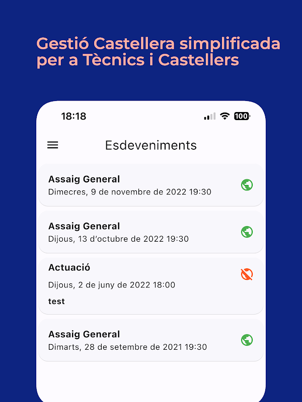 Aplicación para ayudar a crear ensayos castellers. Ayuda a gestión de personas del grupo, crear alineaciones de las estructuras y controlar la asistencia de los castellers. También permite el almacenamiento de fotografías para analizar posterior cada prueba que se haga.