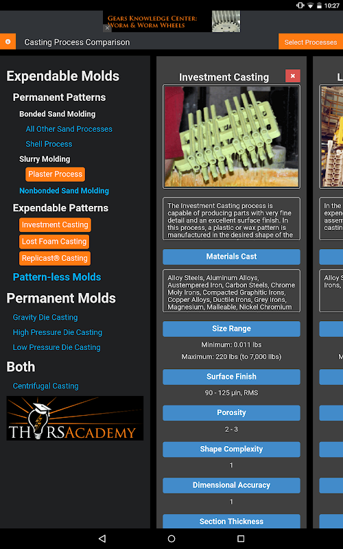 Procesos de fundición comparan para mostrar sus capacidades relativas.