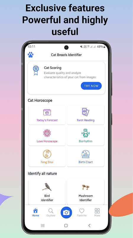 Identificación Instantánea de Razas: Usa tu cámara para tomar una foto de tu gato, y nuestra aplicación identificará instantáneamente su raza a partir de una base de datos completa.