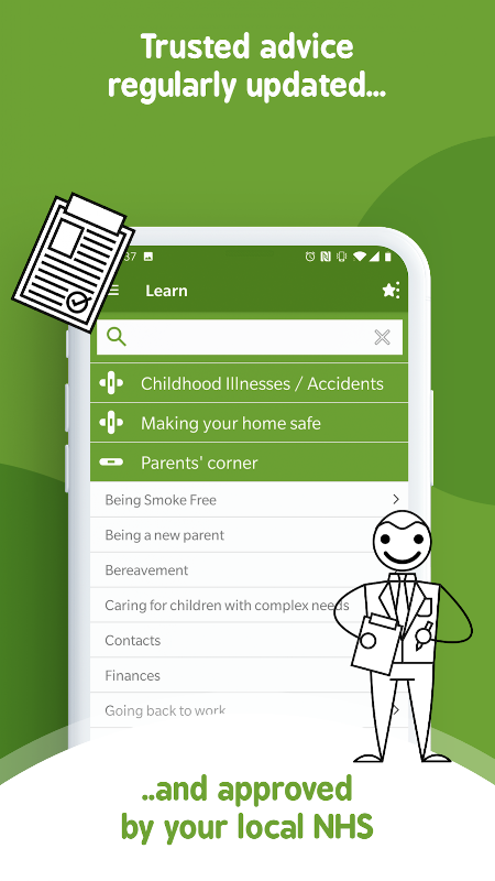 - Sección de emergencia: información esencial sobre qué hacer en una emergencia, como quemaduras y escaldaduras o cómo ayudar a un niño que se está asfixiando. Estos artículos pueden revisarse en cualquier momento, por lo que se siente mejor preparado si se necesita ayuda urgente. La sección también incluye botones para llamar al '999' y al '111'.
