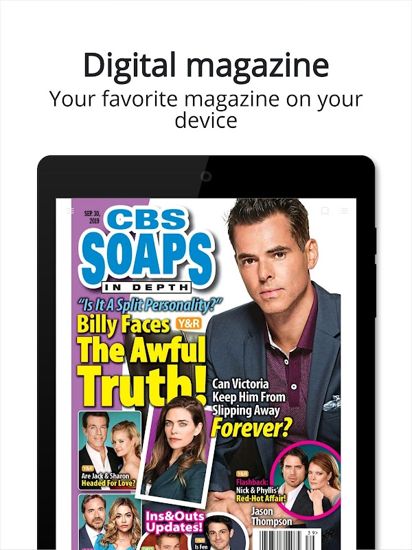 CBS Soaps In Depth is THE magazine for fans of "The Young & the Restless" and "The Bold & the Beautiful," providing more coverage of those sudsers than any other magazine out there! Exclusive previews, insightful recaps, revealing interviews, private photos --- CBS Soaps In Depth has it all! Plus, our "Days of Our Lives" bonus section keeps you up to date on all the latest goings-on in Salem and our primetime features shine a spotlight on the evening soaps, like "Scandal" and "Revenge"!
