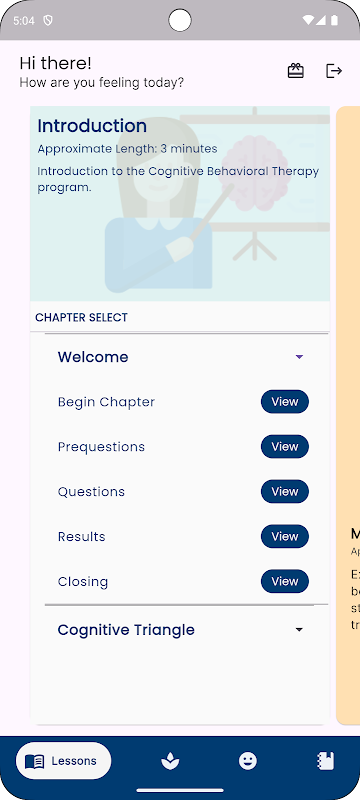 La Dra. Lauren (terapeuta) guía a los usuarios a través de las sesiones desde una consulta virtual. Consta de ocho sesiones de TCC diseñadas para enseñar habilidades cognitivo-conductuales para el control de pensamientos, emociones y conductas disfuncionales. Los módulos (algunos de tan solo 5 minutos de duración, otros de aproximadamente 15 a 20 minutos, según la participación del usuario) incluyen psicoeducación sobre la interacción de pensamientos, sentimientos y conductas; comprensión de los antecedentes, la respuesta y las consecuencias de las conductas; pensamientos automáticos; trampas del pensamiento; pensamientos desafiantes; conductas desafiantes; afrontamiento mediante la "conexión a tierra"; y finaliza con una revisión.