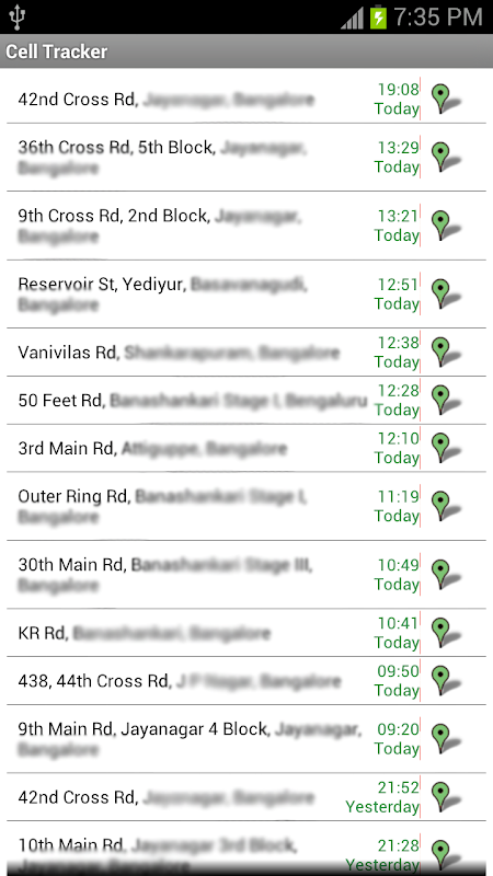 Utilice la aplicación Cell Tracker para realizar un seguimiento de la ubicación de su celular. Realice un seguimiento de todas las ubicaciones que ha visitado en los últimos días con su teléfono Android. Para verificar las ubicaciones visitadas, debe iniciar la aplicación y hacer clic en "Ver ahora". La aplicación recopila información de ubicación una vez cada 0,5 horas a través de GPRS / Wi-Fi y, por lo tanto, el impacto en la batería es mínimo.