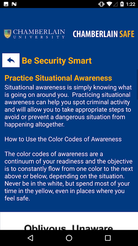 Chamberlain Safe es la aplicación oficial de seguridad de la Universidad de Chamberlain. Es la única aplicación que se integra con los sistemas de seguridad de Chamberlain University. El Departamento de Seguridad y Protección ha trabajado para desarrollar una aplicación única que brinda a los estudiantes, profesores y personal una mayor seguridad en el campus de la Universidad de Chamberlain. La aplicación le enviará importantes alertas de seguridad y brindará acceso instantáneo a los recursos de seguridad del campus.