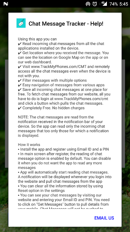 ▪ Puede ver sus mensajes de chat visitando nuestro sitio web e ingresando su ID de correo electrónico y PIN. Debe hacer clic en el botón "Obtener detalles" para obtener detalles de su dispositivo móvil. Los mensajes de chat no se enviarán al servidor automáticamente y sin su consentimiento.