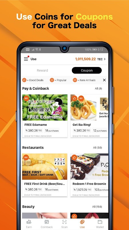 Puede usar las monedas para canjear muchos cupones en restaurantes y salones de belleza, entre otros, tanto en tiendas físicas como en línea. Lo mejor es que también puede realizar pagos con monedas en algunos de nuestros comercios asociados.