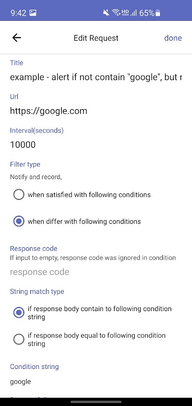 1. Configure la URL, el intervalo, el método de condición, el texto correspondiente a la condición, etc.