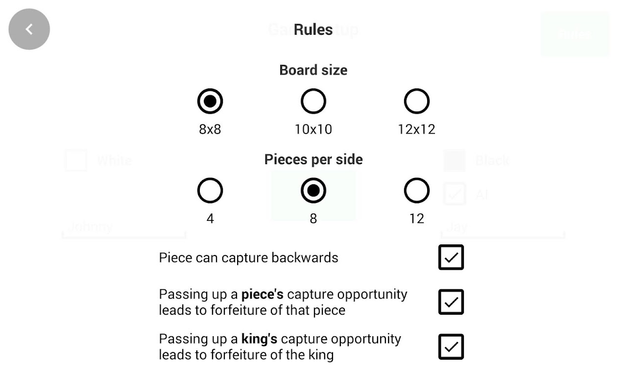 Puedes elegir el tamaño del tablero: 8x8, 10x10 o 12x12. Según tus preferencias, también puedes elegir el número de piezas y otras reglas, que encontrarás en la sección de reglas del juego.