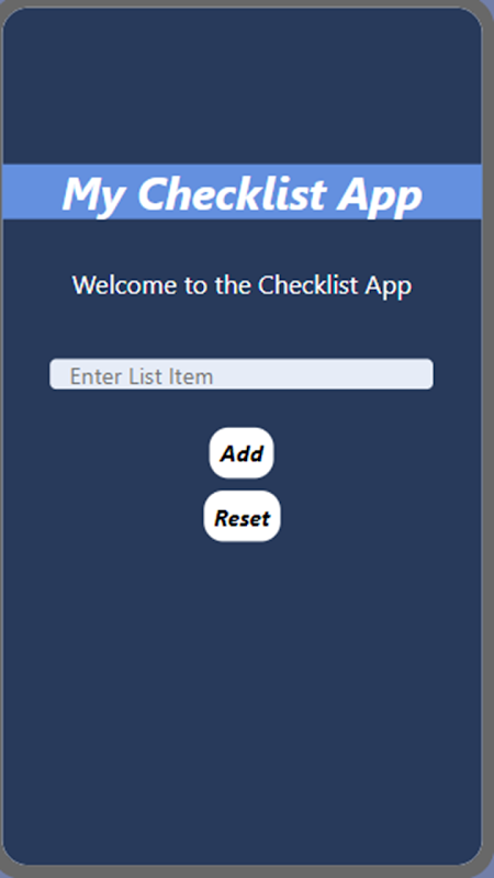 La Lista de verificación proporciona una forma más sencilla de almacenar cosas que no puedes recordar en tu vida diaria. Simplemente agregue lo que desea agregar a su lista de verificación y presione "agregar". ¿Necesitas restablecer tu lista para ver algo nuevo? No se preocupe, simplemente presione "reiniciar" y así tendrá una nueva lista de verificación funcional.