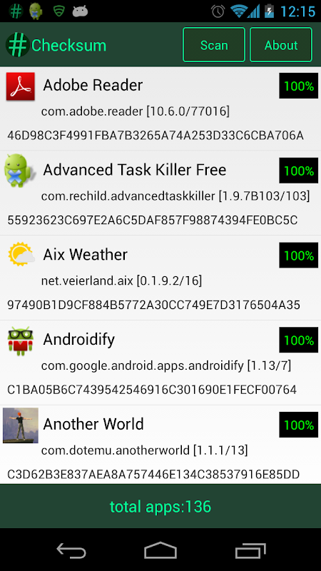 Since such checksums are not available, the database is constantly being builded up and improved thanks to users' contributions: each user, by simply using this app, automagically submits his apps checksums, which, in turn, are checked with other values submitted by other users: a final "report" drawn up according to the "statistic diffusion" of hashes lets this application show, for each featured app, a value of "goodness" that is to say how many users have the same hash of yours!