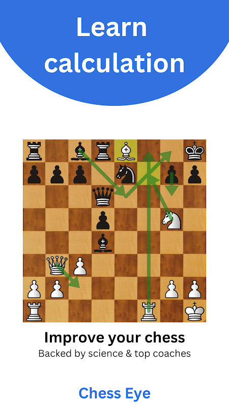 ChessEye mejora tu calificación a través de la visualización del ajedrez y el entrenamiento de cálculo. Los viejos maestros del ajedrez se fortalecieron a través del juego personal, el análisis, jugando con oponentes fuertes y analizando partidas con ellos. ChessEye te hace un jugador más fuerte replicando el mismo proceso.