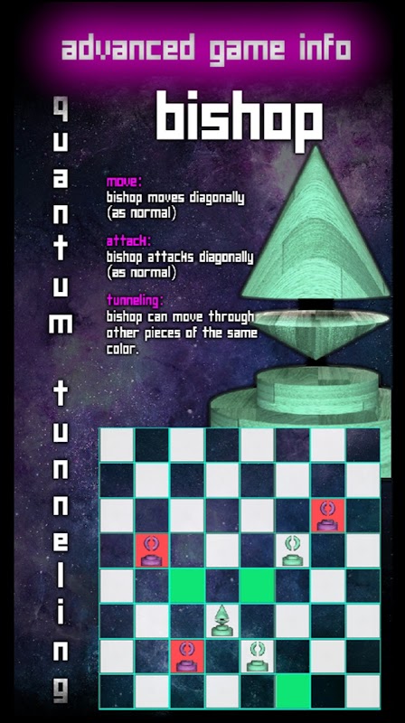 Para los principiantes, hemos incluido una sección de "Aprender" en el juego que proporciona información detallada sobre las habilidades de cada pieza y algunos cambios leves en las reglas de Quantum Gambit.