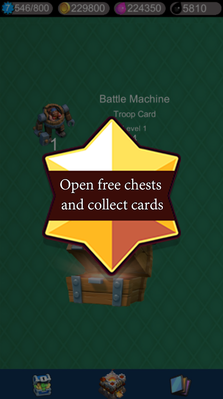 Battle Chest Simulator Clicker for Clash of Clans allows you to open free chests for resources and allows you to upgrade buildings, troops, and hero cards through this simulator clicker. Please not that cards will not be transferred to the official "Clash of Clans" game, made by "Supercell".