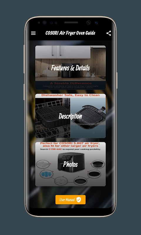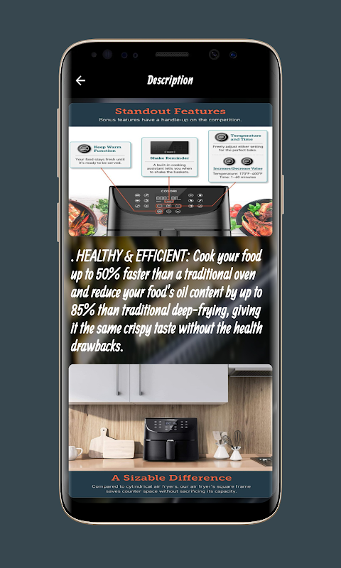 La aplicación COSORI Air Fryer Oven Guide contiene mucha información y características del COSORI Air Fryer Oven, que puede obtener de forma clara y sencilla. A través de la aplicación COSORI Air Fryer Oven Guide, puede ver un video del COSORI Air Fryer Oven, que le permite Conozca la apariencia de la COSORI Air Fryer Oven Guide y sus muchas características diferentes, incluida la cocina sin estrés: Conozca la Pro 5.8-Quart Air Fryer, la herramienta altamente eficiente que ofrece sabores fritos saludables en la encimera de su