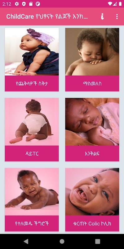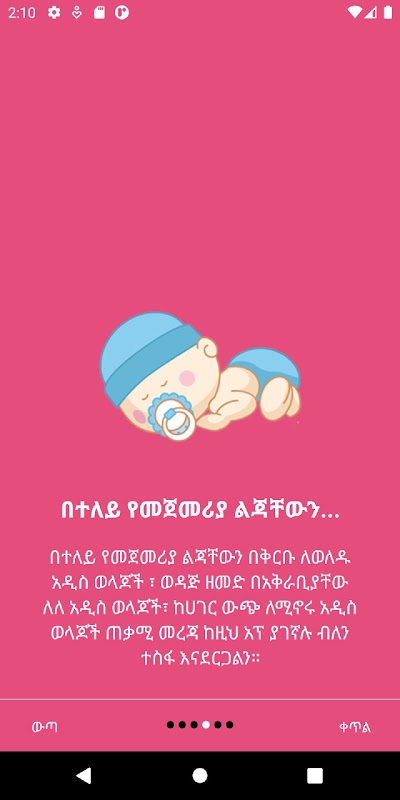ይህ የሞባይል አፕልኬሽን የጨቅላ ህጻናትን የመጀመሪያ 12 ወራት አስተዳደግ እና እንክብካቤ መጠነኛ ግንዛቤ ለወላጆች ለማስጨበጥ የተዘጋጀ ነው። ከዚህ አፕልኬሽን አዲስ ለተወለደ ህፃን መሠረታዊና ጠቃሚ የሆኑ የሕፃናት እንክብካቤ ምክሮች ይገኛሉ።