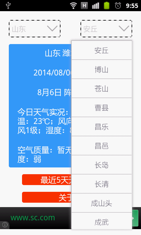 此应用支持中国各省各市各县的天气预报, 支持各种手机分辨率, 平板支持800X1280分辨率