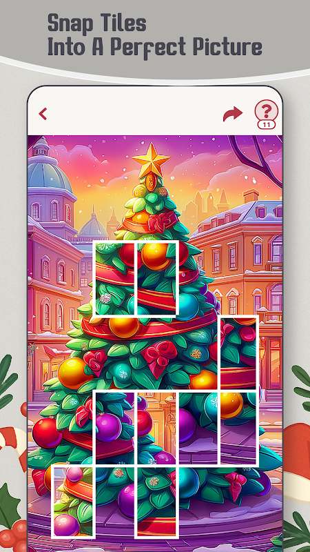 • Modo Giratorio: un rompecabezas táctil giratorio que se juega como un rompecabezas de anillos moderno. Gira suavemente los anillos para realinear adornos y luces: la esencia de un rompecabezas navideño sin el desorden.