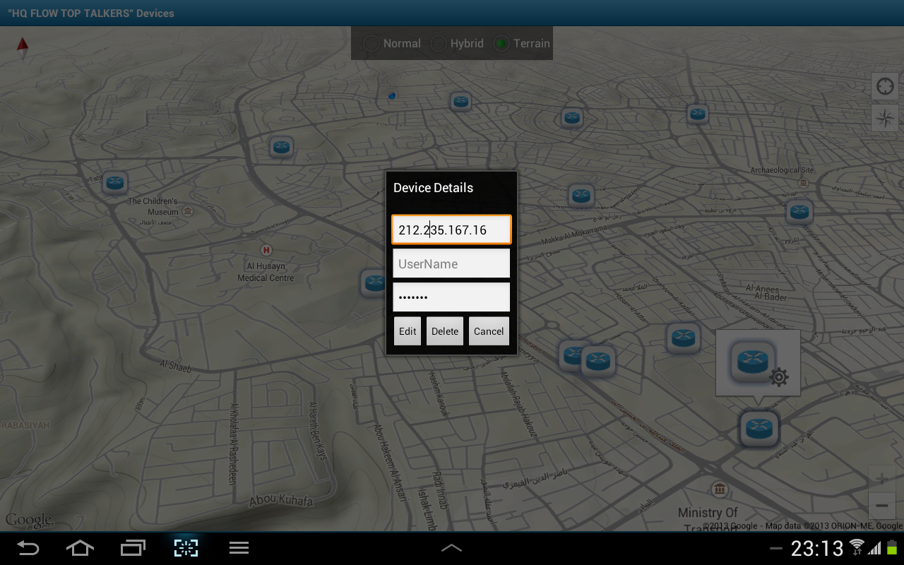 The popup bubble for each of the defined Router devices includes a "Settings" icon which links the user to the device's credentials which the user needs to fill-in as per the actual router configuration.