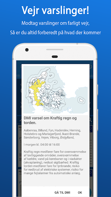 Puede obtener el clima de hoy de DMI tocando el ícono de notificación en la aplicación. Luego, obtiene el clima de hoy en texto de DMI, dondequiera que esté.