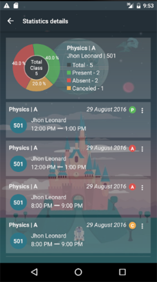 ✓ estadísticas Get clase (presente, ausente y cancelado porcentajes).
