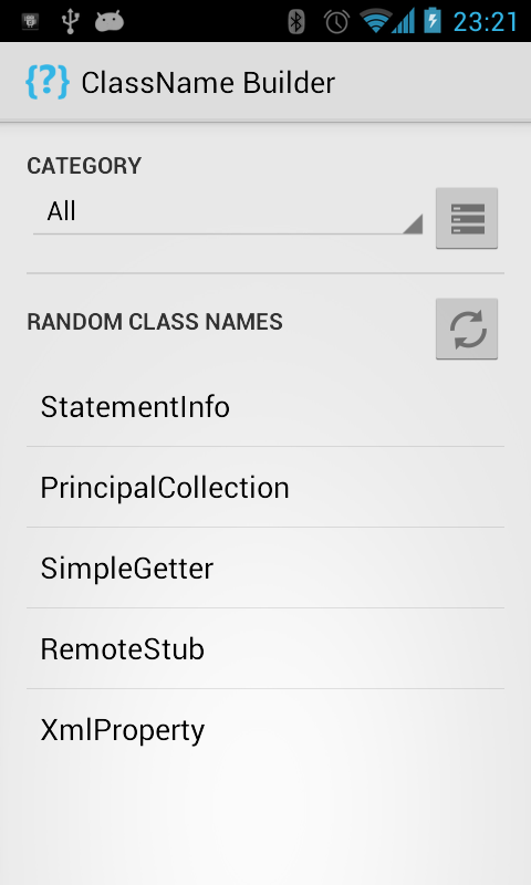 La aplicación contiene palabras agrupados por componentes, descriptores y acciones. El usuario también puede generar Random Class Nombre de la categoría seleccionada.