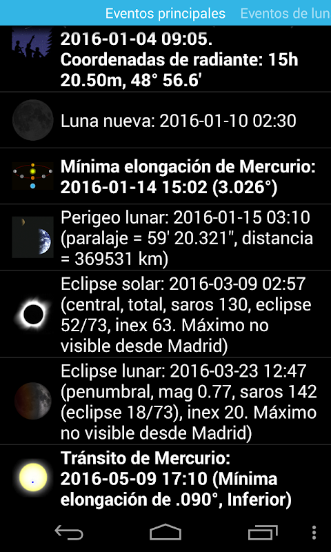 - Listas más completas de los próximos eventos astronómicos (lunar-X, neomenia), eventos de satélites naturales (tránsitos, sombras, eclipses y eventos mutuos en satélites de Júpiter, Saturno, y Urano, y próximos tránsitos de exoplanetas), y satélites artificiales (tránsitos sobre el observador, sobre los discos del Sol, la Luna, y los planetas, y fogonazos de los satélites Iridium).