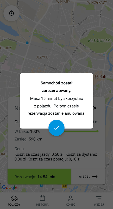 Znajdź pojazd najbliżej Ciebie i kliknij na flagę, a potem zarezerwuj. Masz teraz 15 minut, by do niego dotrzeć - kliknij nawiguj, a Google Maps wskaże Ci drogę. Gdy będziesz przy pojeździe kliknij w aplikacji ikonę otwarcia drzwi - teraz rozpoczął się najem (pierwsza minuta darmowa). Sprawdź stan auta i jego ogólną sprawność. Jest ok? Możesz cieszyć się podróżą. Jedź gdzie chcesz, parkuj za darmo i korzystaj z internetu kiedy masz na to ochotę.