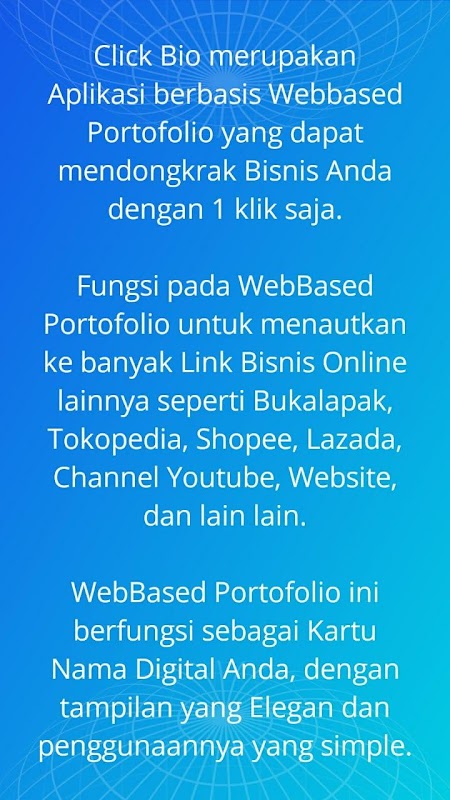 Fungsi WebBased Portofolio ClickBio ini seperti Kartu Nama Digital yang dengan keistimewaan nya untuk Presentasi kan Bisnis dengan Simple dan Elegan