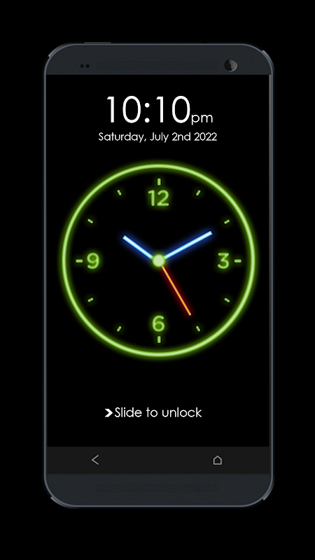 También puede habilitar y deshabilitar el nuevo bloqueo de pantalla del reloj brillante de neón (reloj analógico) como bloqueo de pantalla predeterminado. Deslice hasta Desbloquear e ingrese el código de acceso que ha establecido. Atractivas manecillas del reloj que brillan intensamente moviendo la animación en tiempo real. Hermoso bloqueo de pantalla de reloj de neón es una buena aplicación con gráficos hermosos y de alta definición.