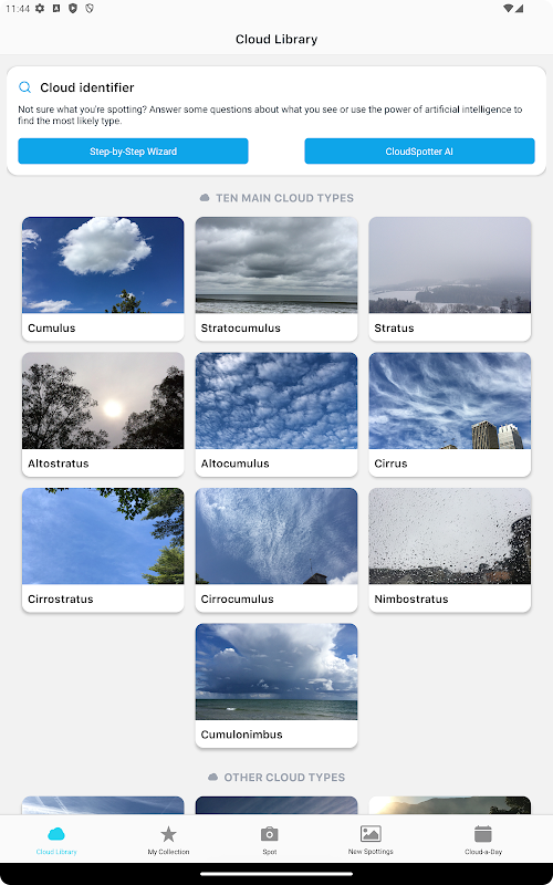 Aprende a detectar 58 formaciones nubosas y efectos ópticos diferentes, desde las más comunes, como los cúmulos y los arcoíris, hasta las más inusuales, como la fugaz nube fluctus o el difícil de detectar arco circuncenital. Descubre qué hace especial a cada formación con textos de expertos de la Sociedad de Apreciación de las Nubes e impresionantes fotografías de referencia de usuarios de nuestra app de todo el mundo.